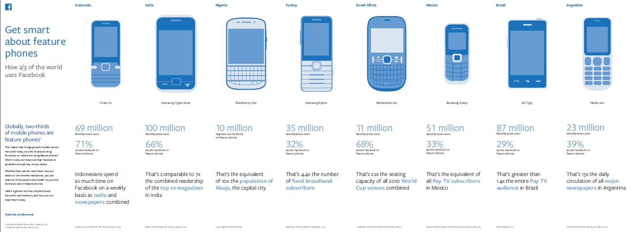 Lanskap media yang terbagi-bagi di negara dengan pertumbuhan tinggi berikut biaya yang timbul dari konektivitas internet selama ini telah membuat pengiklan menghadapi kesulitan menjangkau orang secara luas. Teknologi mobile bersama dengan Facebook kini memungkinkan itu dilakukan. Sebagai gambaran, 84 persen dari 100 juta lebih orang pengguna Facebook di India mengakses Facebook melalui mobile. Sementara 87 persen dari 69 juta orang pengguna Facebook di Indonesia juga mengaksesnya melalui Facebook. Sedangkan 72 persen dari 87 juta orang pengguna Facebook di Brasil juga mengakses Facebook melalui mobile. Lihat visual terlampir untuk infografik penggunaan feature phone di beberapa negara termasuk India, Indonesia dan Brasil.